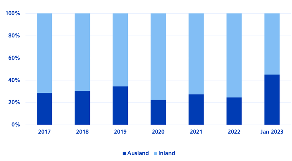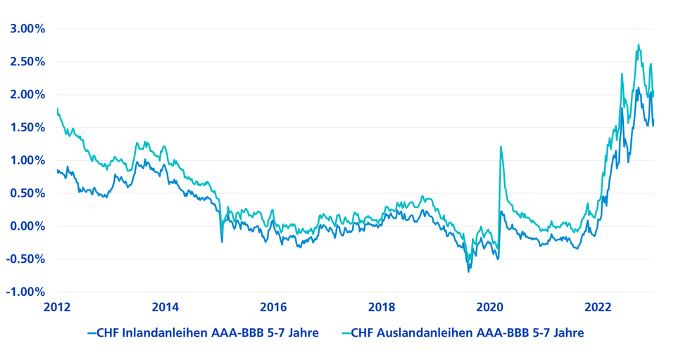 Das Emissionsgeschäft für in Schweizer Franken gehandelten Obligationen (CHF-Obligationen) ist fulminant ins neue Jahr gestartet. In den ersten drei Wochen wurden Anleihen von nominal knapp CHF 10 Milliarden emittiert. Besonders erfreulich: Ausländische Schuldner melden sich zurück. Ihr Marktanteil gemessen am Emissionsvolumen liegt bei über 40 Prozent (Stand: Ende Januar 2023).