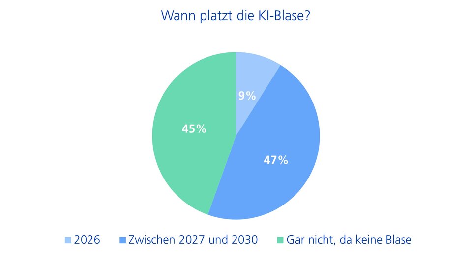 Im Rahmen dieser Swisscanto CIO Survey wurden die befragten CIOs um ihre Einschätzung zur aktuellen Marktentwicklung im Bereich Künstliche Intelligenz (KI) gebeten. Dabei zeigte sich ein geteiltes Meinungsbild: 45% der Befragten sehen die aktuelle Situation nicht als Blase an. Gleichzeitig erwartet jedoch fast die Hälfte der CIOs, dass die KI-Blase zwischen 2027 und 2030 platzen wird. Trotz der aktuellen Präsenz des Themas in der Öffentlichkeit sind es lediglich 9% der Befragten, die bereits im Jahr 2026 mit einem solchen Szenario rechnen (siehe Abbildung 4).