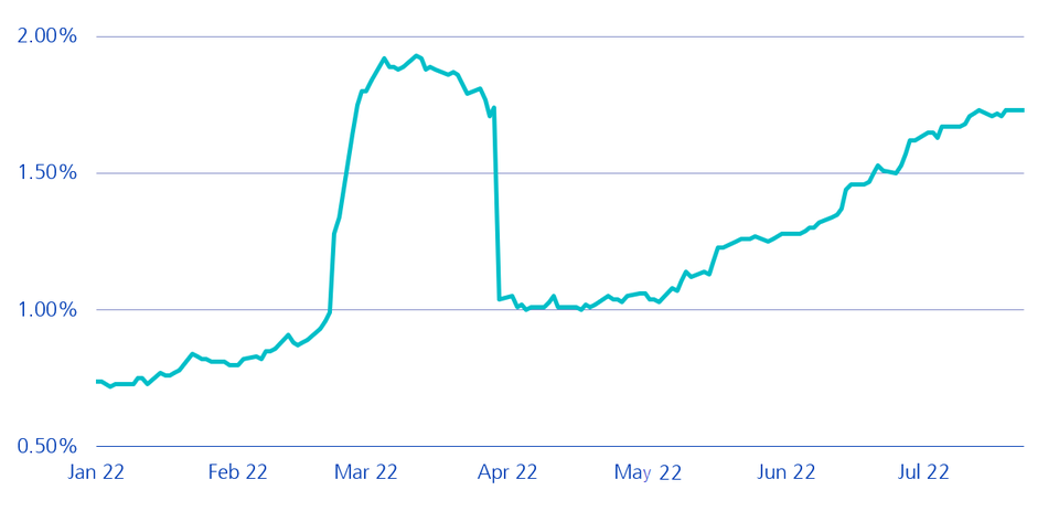 - Credit risk reflects the risk of default by the issuer and is reported as a credit risk premium compared to risk-free government bonds. Chart 2 shows the increased credit risk premiums for CHF corporate bonds with a BBB rating. The sharp increase followed by the sudden drop in premiums in February and March 2022 is attributable to the CHF bonds issued by Russia. As of the end of March 2022, these bonds are no longer represented in the index universe. It can be observed (when excluding the Russian effect) that credit risk premiums of companies have risen continuously since the beginning of the year. In the second quarter of 2022, the increase accelerated.