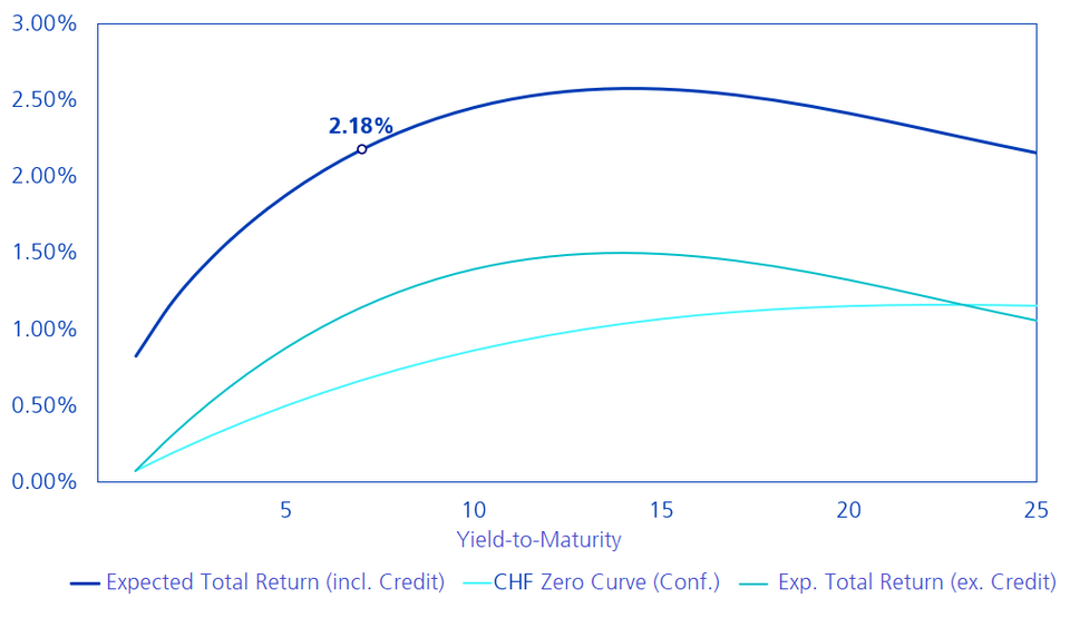 In view of the increased interest rates and higher credit premiums, the yield expectations for CHF bonds have changed significantly. The expected total yield has increased sharply. For the most commonly used Swiss bond benchmark, the Swiss Bond Index AAA-BBB (SBI), the annual expected yield is now 2.18%. As can be seen in Chart 3, the total yield results from the two yield drivers: credit premium and interest income. If you only invested in safe Confederation bonds, the expected annual yield would be around 1% without changes to the yield curve.