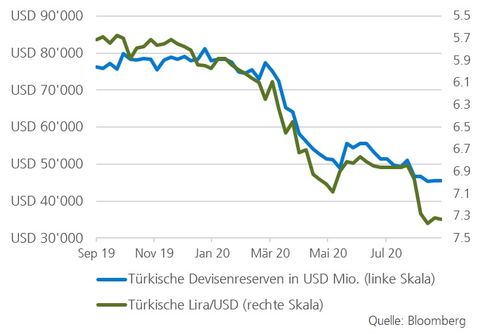 Wir gehen davon aus, dass die Kapitalzuflüsse in den kommenden Monaten angesichts der unattraktiven realen Renditen und der hohen politischen und wirtschaftlichen Risiken tief bleiben werden. Die vom Tourismussektor verzeichneten Zuflüsse in der Leistungsbilanz stagnieren auf sehr tiefem Niveau - sie beliefen sich im Juni 2020 auf lediglich 4% des Vorjahresbetrages, im Juli 2020 auf 14%.